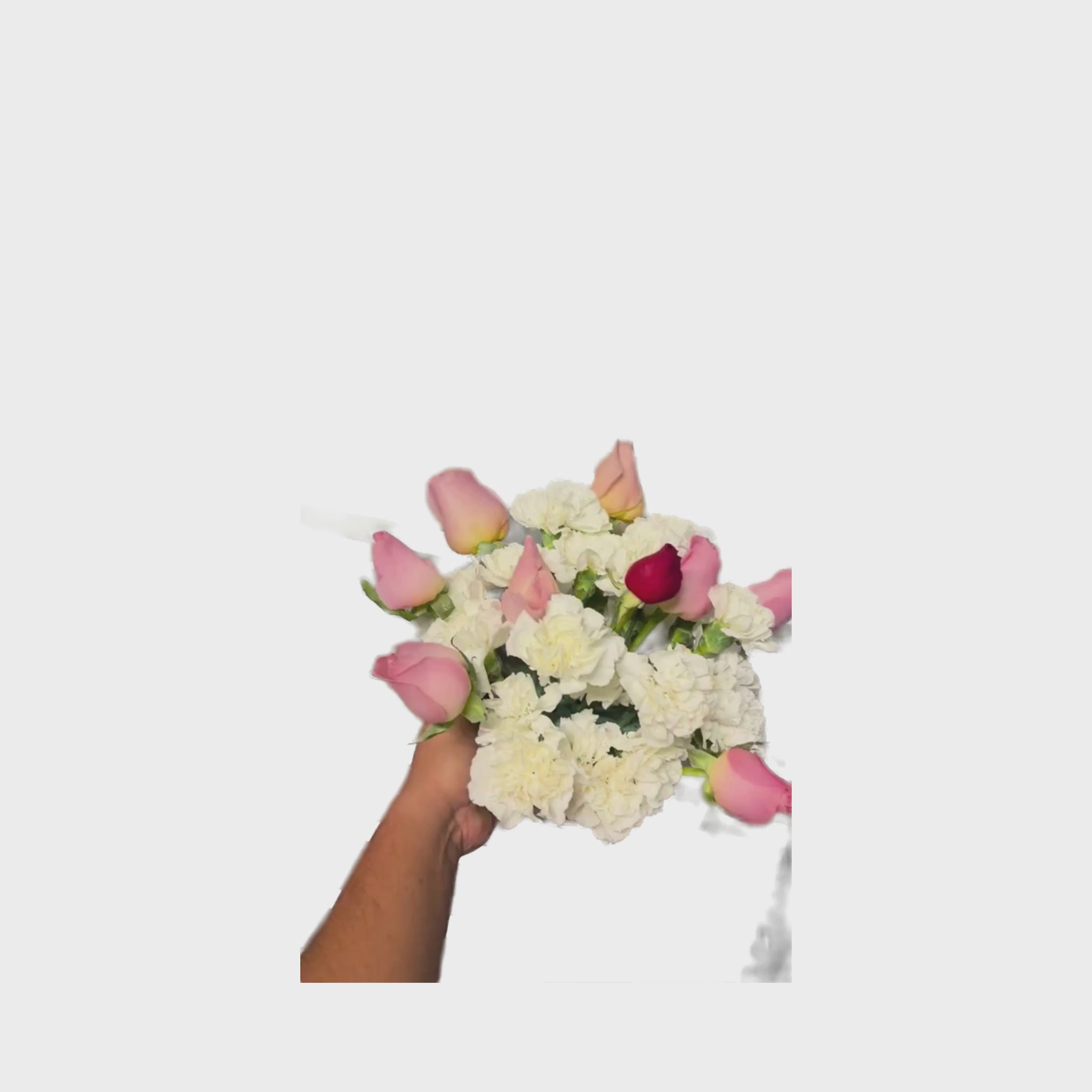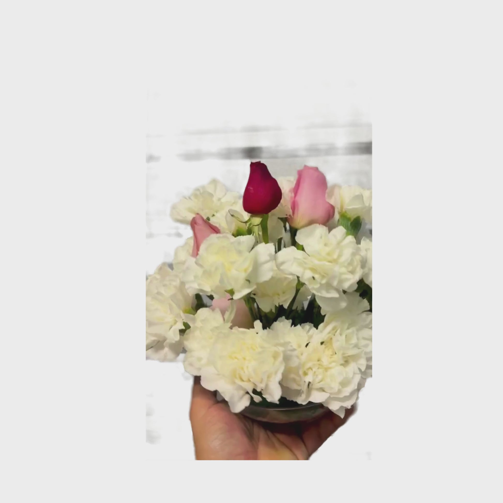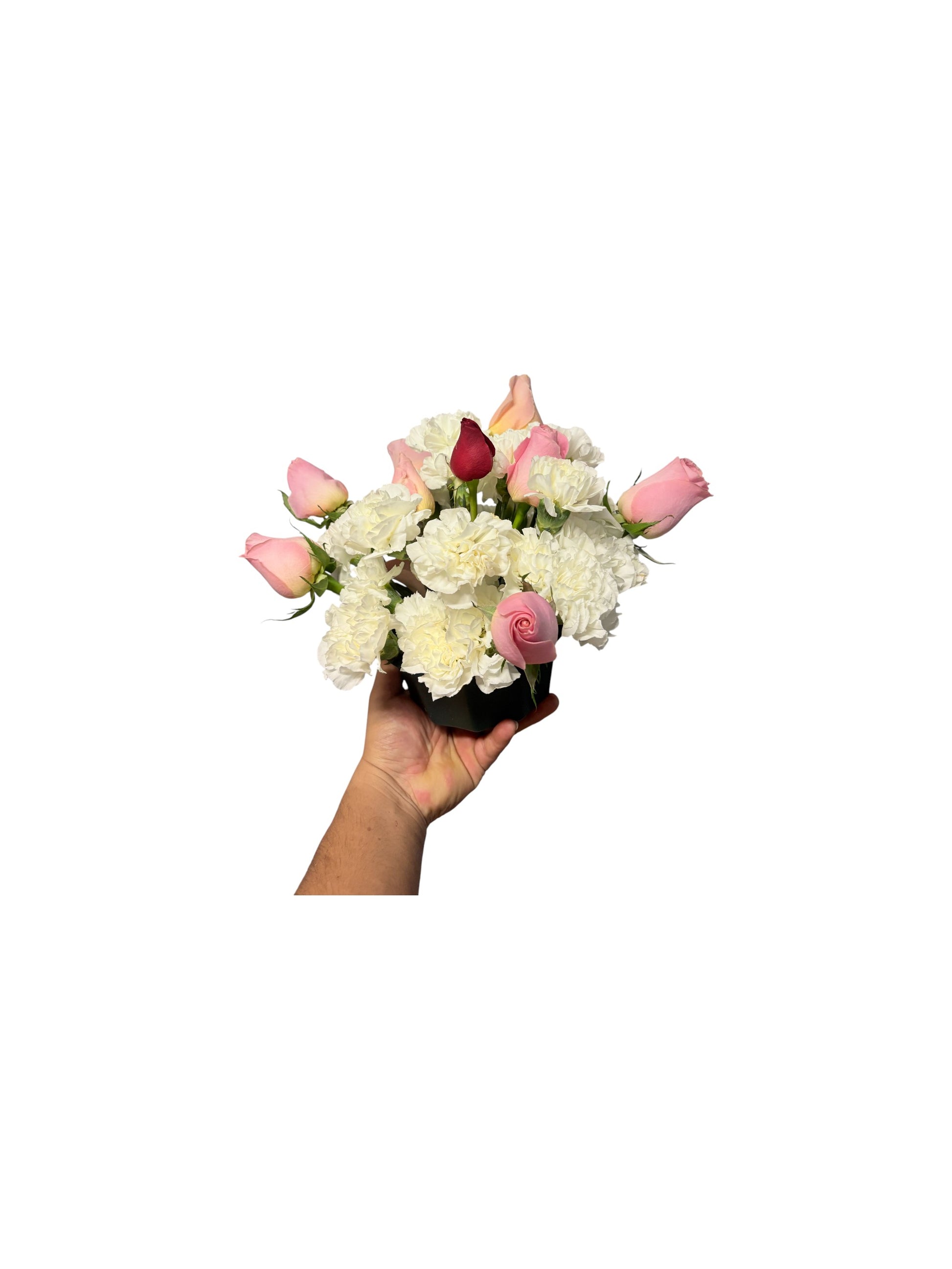Each arrangement includes soft pink roses, a single bold red rose, and white dahlias, designed for balance, texture, and romance. Perfect for desks, countertops, and intimate spaces, these container arrangements offer beauty without the need for a traditional wrap.